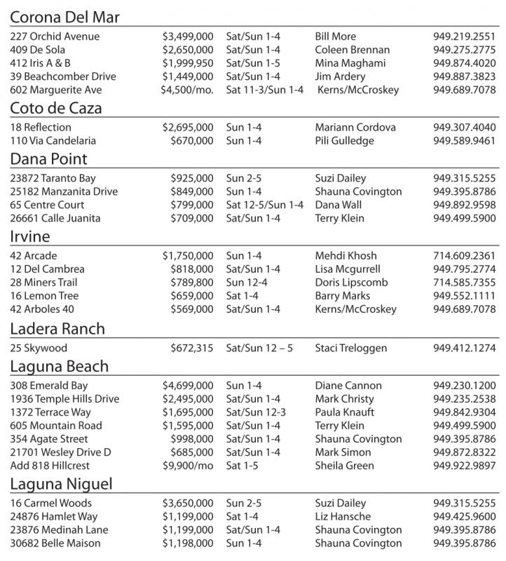 227 Orchid Avenue $3,499,000 Sat/Sun 1-4 Bill More 949.219.2551 409 De Sola $2,650,000 Sat/Sun 1-4 Coleen Brennan 949.275.2775 412 Iris A&B $1,999,950 Sat/Sun 1-5 Mina Maghami 949.874.4020 39 Beachcomber Drive $1,449,000 Sat/Sun 1-4 Jim Ardery 949.887.3823 602 MargueriteAve $4,500/mo. Sat 11-3/Sun 1-4 Kerns/McCroskey 949.689.7078 Coto de Caza 18 Reflection $2,695,000 Sun 1-4 Mariann Cordova 949.307.4040 110 ViaCandelaria $670,000 Sun 1-4 Pili Gulledge 949.589.9461