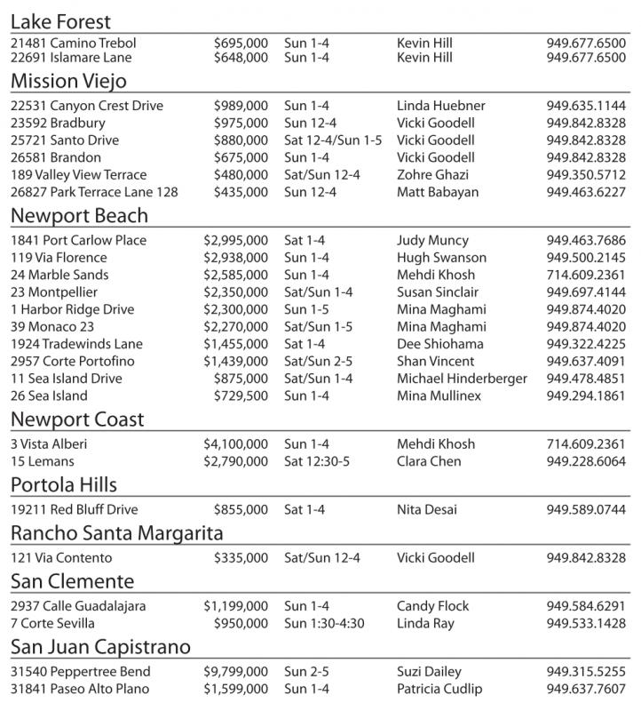 19211 Red Bluff Drive $855,000 Sat 1-4 Nita Desai 949.589.0744 Rancho Santa Margarita 121 ViaContento $335,000 Sat/Sun 12-4 VickiGoodell 949.842.8328 San Clemente 2937 Calle Guadalajara $1,199,000 Sun 1-4 Candy Flock 949.584.6291 7Corte Sevilla $950,000 Sun 1:30-4:30 Linda Ray 949.533.1428