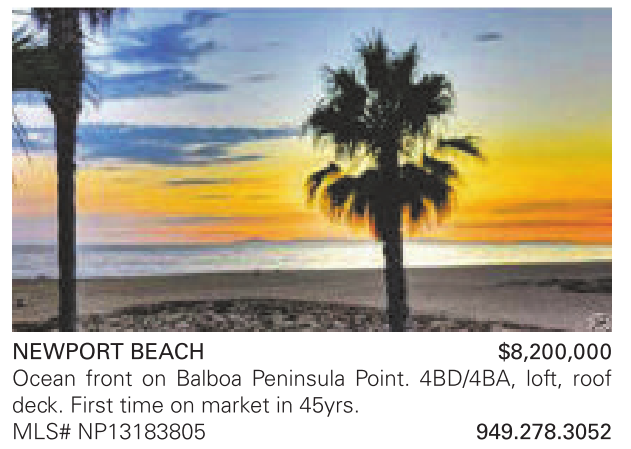 NEWPORT BEACH $8,200,000 Ocean front on Balboa Peninsula Point. 4BD/4BA, loft, roof deck. First time on market in 45yrs. MLS# NP13183805 949.278.3052