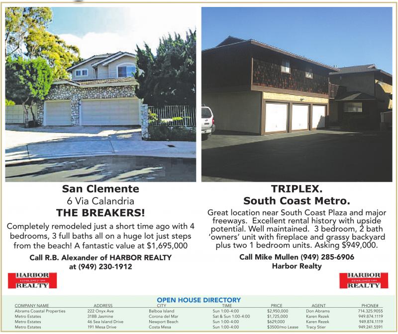 San Clemente 6 Via Calandria THE BREAKERS! Completely remodeled just a short time ago with 4 bedrooms, 3 full baths all on a huge lot just steps from the beach! A fantastic value at $1,695,000 Call R.B. Alexander of HARBOR REALTY at (949) 230-1912 TRIPLEX. South Coast Metro. Great location near South Coast Plaza and major freeways. Excellent rental history with upside potential. Well maintained. 3 bedroom, 2 bath ‘owners’ unit with fireplace and grassy backyard plus two 1 bedroom units. Asking $949,000. Call Mike Mullen (949) 285-6906 Harbor Realty OPEN HOUSE DIRECTORY COMPANY NAME ADDRESS CITY TIME PRICE AGENT PHONE# Abrams Coastal Properties 222 Onyx Ave Balboa Island Sun 1:00-4:00 $2,950,000 Don Abrams 714.325.9055 Metro Estates 318B Jasmine Corona del Mar Sat &Sun 1:00-4:00 $1,725,000 Karen Rezek 949.874.1119 Metro Estates 46Sea Island Drive Newport Beach Sun 1:00-4:00 $629,000 Karen Rezek 949.874.1119 Metro Estates 191 Mesa Drive Costa Mesa Sun 1:00-4:00 $3500/mo Lease Tracy Stier 949.241.5591
