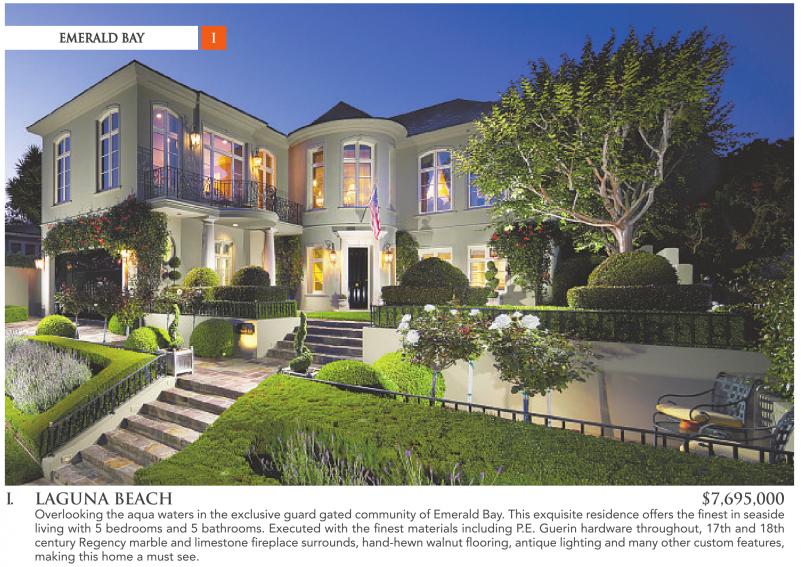 EMERALD BAY I I. LAGUNA BEACH $7,695,000 Overlooking the aqua waters in the exclusive guard gated community of Emerald Bay. This exquisite residence offers the finest in seaside living with 5 bedrooms and 5 bathrooms. Executed with the finest materials including P.E. Guerin hardware throughout, 17th and 18th century Regency marble and limestone fireplace surrounds, hand-hewn walnut flooring, antique lighting and many other custom features, making this home a must see.