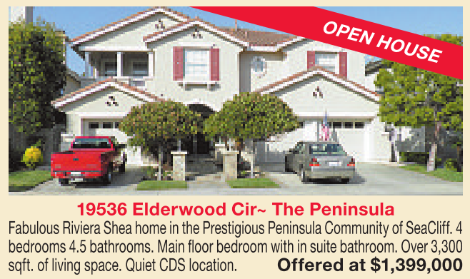19536 Elderwood Cir~ The Peninsula FabulousRivieraSheahome in thePrestigiousPeninsula CommunityofSeaCliff. 4 bedrooms 4.5bathrooms.Mainfloor bedroom with in suitebathroom. Over 3,300 sqft. ofliving space. Quiet CDS location. Offered at $1,399,000