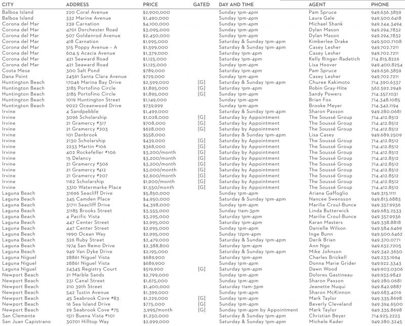 Balboa Island 220 Coral Avenue $2,900,000 Sunday 1pm-4pm Pam Spruce 949.636.3859 Balboa Island 332 Marine Avenue $1,490,000 Sunday 1pm-4pm Laura Gale 949.500.6418 Corona del Mar 239 Carnation $4,100,000 Sunday 1pm-4pm Michael Shank 949.244.3494 Corona del Mar 4701 Dorchester Road $3,095,000 Sunday 1pm-4pm Dylan Mason 949.294.7832 Corona del Mar 507 Goldenrod Avenue $2,450,000 Sunday 1pm-4pm Dylan Mason 949.294.7832 Corona del Mar 418 Carnation $1,995,000 Saturday & Sunday 1pm-4pm Kimberlee Drake 949.500.7108 Corona del Mar 515 Poppy Avenue – A $1,599,000 Saturday & Sunday 1pm-4pm Casey Lesher 949.702.7211 Corona del Mar 604.5 Acacia Avenue $1,379,000 Saturday 1pm-4pm Casey Lesher 949.702.7211 Corona del Mar 421 Seaward Road $1,125,000 Saturday 1pm-4pm Kelly Ringer-Radetich 714.815.8226 Corona del Mar 421 Seaward Road $1,125,000 Sunday 1pm-4pm Lisa Hoover 949.400.8254 Costa Mesa 300 Salt Pond $789,000 Saturday 1pm-4pm Pam Spruce 949.636.3859 Dana Point 24561 Santa Clara Avenue $729,000 Sunday 1pm-4pm Casey Lesher 949.702.7211 Huntington Beach 17046 Marina Bay Drive $2,599,000 [G] Saturday & Sunday 1pm-4pm Churee Kakimoto 714.390.6337 Huntington Beach 3185 Portofino Circle $1,895,000 [G] Saturday 1pm-4pm Robin Gray-Hite 562.592.2946 Huntington Beach 3185 Portofino Circle $1,895,000 [G] Sunday 1pm-4pm Sandy Powers 714.357.1031 Huntington Beach 1019 Huntington Street $1,149,000 Sunday 1pm-4pm Brian Fox 714.348.1085 Huntington Beach 9022 Oceanwood Drive $739,999 Sunday 1pm-4pm Brooke Meyer 714.342.1194 Irvine 4 Sandpebble $1,499,000 Saturday & Sunday 1pm-4pm Sharon Paxson 949.280.0681 Irvine 3096 Scholarship $1,028,000 [G] Saturday by Appointment The Soussé Group 714.412.8512 Irvine 21 Gramercy #317 $708,000 [G] Saturday by Appointment The Soussé Group 714.412.8512 Irvine 21 Gramercy #203 $628,000 [G] Saturday by Appointment The Soussé Group 714.412.8512 Irvine 101 Danbrook $558,000 Saturday & Sunday 1pm-4pm Lisa Casey 949.689.2509 Irvine 2130 Scholarship $439,000 [G] Saturday by Appointment The Soussé Group 714.412.8512 Irvine 2233 Martin #106 $368,000 [G] Saturday by Appointment The Soussé Group 714.412.8512 Irvine 402 Rockefeller #106 $3,200/month [G] Saturday by Appointment The Soussé Group 714.412.8512 Irvine 15 Delancy $3,200/month [G] Saturday by Appointment The Soussé Group 714.412.8512 Irvine 21 Gramercy #306 $3,200/month [G] Saturday by Appointment The Soussé Group 714.412.8512 Irvine 21 Gramercy #412 $3,000/month [G] Saturday by Appointment The Soussé Group 714.412.8512 Irvine 21 Gramercy #207 $2,600/month [G] Saturday by Appointment The Soussé Group 714.412.8512 Irvine 1162 Scholarship $1,900/month [G] Saturday by Appointment The Soussé Group 714.412.8512 Irvine 3310 Watermarke Place $1,550/month [G] Saturday by Appointment The Soussé Group 714.412.8512 Laguna Beach 31696 Seacliff Drive $5,850,000 Sunday 1pm-4pm Ariana Gaffoglio 949.315.1111 Laguna Beach 345 Camden Place $4,950,000 Saturday & Sunday 1pm-4pm Nancee Swensson 949.813.6883 Laguna Beach 31711 Seacliff Drive $4,398,000 Sunday 1pm-4pm Marilie Croul-Bunce 949.357.9936 Laguna Beach 31185 Brooks Street $3,555,000 Sunday 11am-3pm Linda Butterwick 949.683.2533 Laguna Beach 4 Pacific Vista $3,295,000 Saturday 1pm-4pm Marilie Croul-Bunce 949.357.9936 Laguna Beach 447 Center Street $2,995,000 Saturday 1pm-4pm Karan Masters 949.338.8818 Laguna Beach 447 Center Street $2,995,000 Sunday 1pm-4pm Danielle Wilson 949.584.6469 Laguna Beach 1990 Ocean Way $2,995,000 Sunday 12pm-4pm Inge Bunn 949.500.6462 Laguna Beach 326 Ruby Street $2,479,000 Saturday & Sunday 1pm-4pm Derik Brian 949.370.0771 Laguna Beach 1974 San Remo Drive $2,388,800 Saturday 1pm-4pm Ann Ngo 949.632.7205 Laguna Beach 949 Van Dyke Drive $2,195,000 Saturday & Sunday 1pm-4pm Mike Johnson 949.342.3650 Laguna Niguel 28861 Niguel Vista $689,900 Saturday 1pm-4pm Charles Brickell 949.233.1694 Laguna Niguel 28861 Niguel Vista $689,900 Sunday 1pm-4pm Donna Marie Grider 949.922.3343 Laguna Niguel 24345 Registry Court $519,900 [G] Saturday 1pm-4pm Dawn Wood 949.903.0306 Newport Beach 21 Marble Sands $2,799,000 Sunday 1pm-4pm Dolores Gastineau 949.933.9842 Newport Beach 231 Canal Street $1,675,000 Sunday 1pm-4pm Sharon Paxson 949.280.0681 Newport Beach 210 39th Street $1,400,000 Saturday 11am-3pm Jeanette Nuqui 949.842.9887 Newport Beach 542 Tustin Avenue $1,399,000 Sunday 1pm-4pm Sharon McKinnon 949.683.4016 Newport Beach 45 Seabrook Cove #83 $1,229,000 [G] Sunday 1pm-4pm Mark Taylor 949.335.8698 Newport Beach 16 Sea Island Drive $775,000 [G] Sunday 1pm-4pm Beverly Cleveland 949.394.6500 Newport Beach 29 Seabrook Cove #75 3,995/month [G] Sunday 1pm-4pm by Appointment Mark Taylor 949.335.8698 San Clemente 1511 Buena Vista #101 $1,250,000 Saturday & Sunday 1pm-4pm Christian Beyer 714.925.2223 San Juan Capistrano 30701 Hilltop Way $2,999,000 Saturday & Sunday 1pm-4pm Michele Kader 949.280.3245