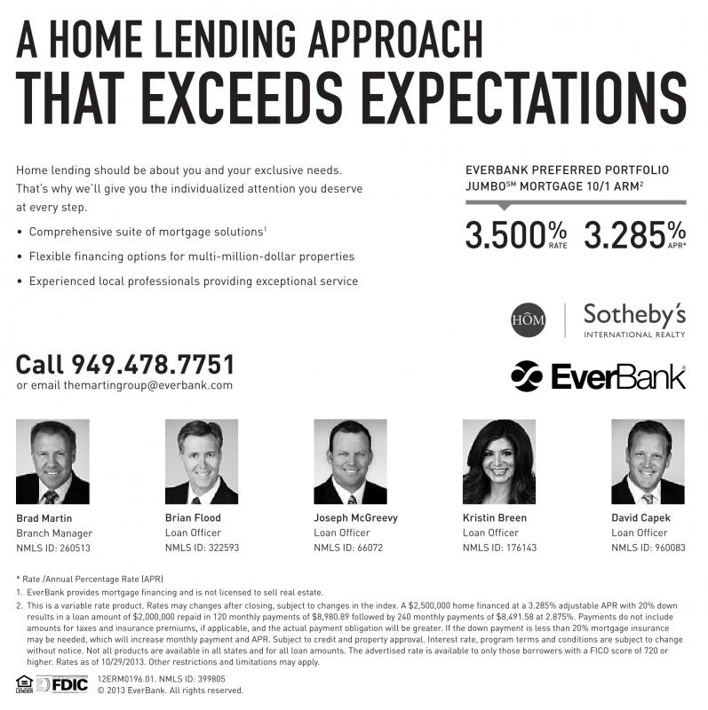 A HOME LENDING APPROACH THAT EXCEEDS EXPECTATIONS Home lending should be about you and your exclusive needs. That’s why we’ll give you the individualized attention you deserve at every step. EVERBANK PREFERRED PORTFOLIO JUMBO SM MORTGAGE 10/1 ARM 2 • Comprehensive suite of mortgage solutions 1 • Flexible financing options for multi-million-dollar properties • Experienced local professionals providing exceptional service 3.500 % RATE 3.285 % APR* Call 949.478.7751 or email themartingroup@everbank.com Brad Martin Branch Manager NMLS ID: 260513 Brian Flood Loan Officer NMLS ID: 322593 Joseph McGreevy Loan Officer NMLS ID: 66072 Kristin Breen Loan Officer NMLS ID: 176143 David Capek Loan Officer NMLS ID: 960083 * Rate /Annual Percentage Rate (APR) 1. EverBank provides mortgage financing and is not licensed to sell real estate. 2. This is a variable rate product. Rates may changes after closing, subject to changes in the index. A $2,500,000 home financed at a 3.285% adjustable APR with 20% down results in a loan amount of $2,000,000 repaid in 120 monthly payments of $8,980.89 followed by 240 monthly payments of $8,491.58 at 2.875%. Payments do not include amounts for taxes and insurance premiums, if applicable, and the actual payment obligation will be greater. If the down payment is less than 20% mortgage insurance may be needed, which will increase monthly payment and APR. Subject to credit and property approval. Interest rate, program terms and conditions are subject to change without notice. Not all products are available in all states and for all loan amounts. The advertised rate is available to only those borrowers with a FICO score of 720 or higher. Rates as of 10/29/2013. Other restrictions and limitations may apply. 12ERM0196.01. NMLS ID: 399805 © 2013 EverBank. All rights reserved.