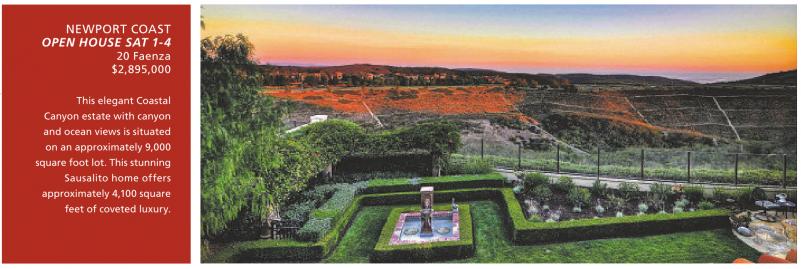 NEWPORT COAST OPEN HOUSE SAT 1-4 20 Faenza $2,895,000 This elegant Coastal Canyon estate with canyon and ocean views is situated on an approximately 9,000 square foot lot. This stunning Sausalito home offers approximately 4,100 square feet of coveted luxury.