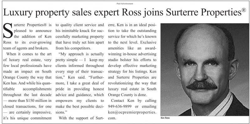 Paid Advertisement Luxury property sales expert Ross joins Surterre Properties ® Surterre Properties® is pleased to announce the addition of Ken Ross to its ever-growing team of agents and brokers. When it comes to the art of luxury real estate, very few local professionals have made an impact on South Orange County the way that Ken has. And while his quantifiable accomplishments throughout the last decade — more than $150 million in closed transactions, for one — are certainly impressive, it’s his unique commitment to quality client service and his inimitable knack for successfully marketing property that have truly set him apart from his competitors. “My approach is actually pretty simple — I keep my clients informed throughout every step of their transaction,” Ken said. “Furthermore, I take a great deal of pride in providing honest advice and guidance, which empowers my clients to make the best possible decisions.” With the support of Surt erre, Ken is in an ideal position to take the outstanding service for which he’s known to the next level. Exclusive amenities like an awardwinning in-house advertising studio bolster his efforts to develop effective marketing strategy for his listings. Ken and Surterre Properties are revolutionizing the way that luxury real estate in South Orange County is done. Contact Ken by calling 949-636-9899 or emailing ken@ocpremierproperties. com. Ken Ross