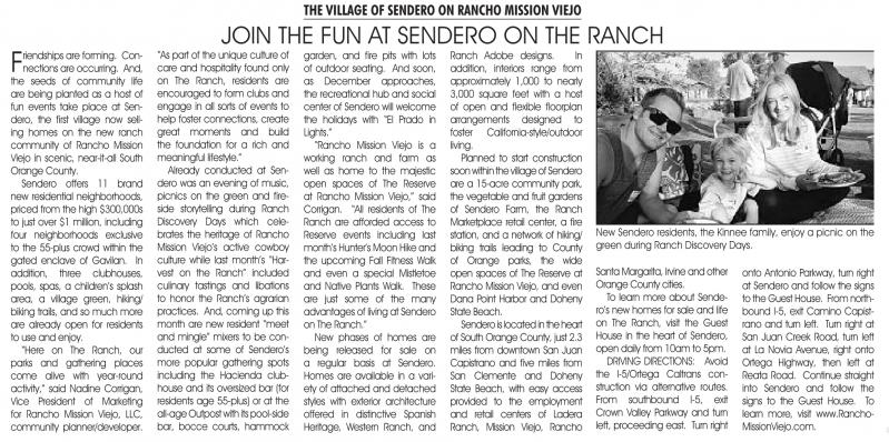 are forming. connections are occurring. And, the seeds of community life are being planted as a host of fun events take place at Sendero, the first village now selling homes on the new ranch community of Rancho mission Viejo in scenic, near-it-all South orange county.