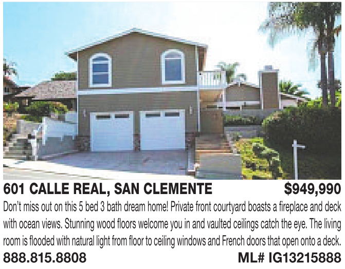 601 CALLE REAL, SAN CLEMENTE $949,990 Don’t miss out on this 5bed 3bath dream home! Private front courtyard boasts afireplace and deck with ocean views. Stunning wood floors welcome you inand vaulted ceilings catch the eye. The living room is flooded with natural lightfromfloor to ceiling windows andFrench doorsthat open onto adeck. 888.815.8808 ML# IG13215888