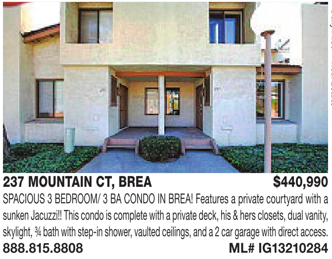 237 MOUNTAIN CT, BREA $440,990 SPACIOUS 3BEDROOM/ 3BACONDO IN BREA! Features aprivate courtyard with asunkenJacuzzi!!Thiscondo is completewithaprivate deck,his &hersclosets,dualvanity, skylight,¾bathwithstep-in shower, vaultedceilings, anda2car garage with direct access. 888.815.8808 ML# IG13210284