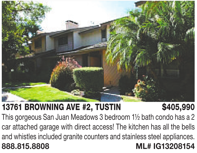 13761 BROWNING AVE #2, TUSTIN $405,990 This gorgeous San Juan Meadows 3bedroom 1½ bathcondohas a2 car attached garage with direct access! The kitchen has all the bells andwhistlesincluded granitecounters andstainless steelappliances. 888.815.8808 ML# IG13208154