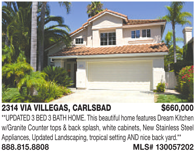 2314 VIA VILLEGAS, CARLSBAD $660,000 **UPDATED 3BED 3BATHHOME. This beautiful home features Dream Kitchen w/Granite Counter tops & back splash, white cabinets, New Stainless Steel Appliances, Updated Landscaping, tropical setting AND nice back yard.** 888.815.8808 MLS# 130057202