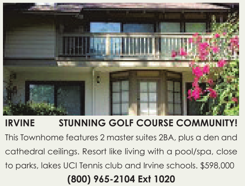 to parks, lakes UCI Tennis club and Irvine schools. $598,000 (800) 965-2104 Ext 1020