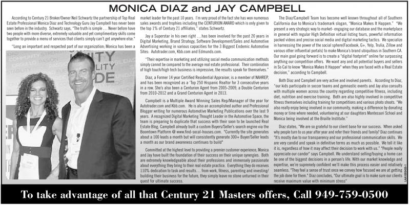The Diaz/Campbell Team has become well known throughout all of Southern California due to Monica’s trademark slogan, “Monica Makes It Happen.” “We present avery strategic way to market- engaging our database and the marketplace in general with regular High Definition virtual listing tours, powerful information packed videos and precise social media and digital marketing tactics. We specialize in harnessing the power of the social sphere(Facebook, G+, Yelp, Trulia, Zillow and various other influential portals) to make Monica’sbrand ubiquitous in Southern CA. Our main goal going forward is to create a"digital footprint" online far surpassing anything our competition offers. Wewant any and all potential buyers and sellers in So Cal to know "Monica Makes It Happen" when they are faced with aReal Estate decision,” according to Campbell.