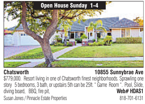 Chatsworth 10855 Sunnybrae Ave $779,000. Resortliving in one of Chatsworth finest neighborhoods. Sprawling one story 5bedrooms, 3bath, or upstairs 5th can be 25ft. “Game Room “. Pool, Slide, diving board, BBQ, firepit, Web# HDAS1 Open House Sunday 1-4 Susan Jones /Pinnacle Estate Properties 818-701-6131