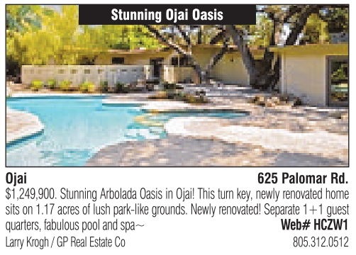 Ojai 625 Palomar Rd. $1,249,900. Stunning Arbolada Oasis in Ojai! This turn key,newly renovated home sits on 1.17 acres of lush park-like grounds. Newly renovated! Separate 1+1 guest quarters, fabulous pool and spa~ Web# HCZW1