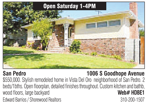 San Pedro 1006 SGoodhope Avenue $550,000. Stylish remodeled home in Vista Del Oro neighborhood of San Pedro. 2 beds/1bths. Open floorplan, detailed finishes throughout. Custom kitchen and bathb, wood floors, large backyard Web# HDBE1