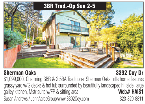 3BR Trad.-Op Sun 2-5 Sherman Oaks 3392 Coy Dr $1,099,000. Charming 3BR &2.5BA Traditional Sherman Oaks hills home features grassy yardw/2decks &hot tub surrounded by beautifully landscaped hillside, large galley kitchen, Mstr suite w/FP &sitting area Web# HAIS1 Susan Andrews /JohnAaroeGroup/www.3392Coy.com 323-829-8811