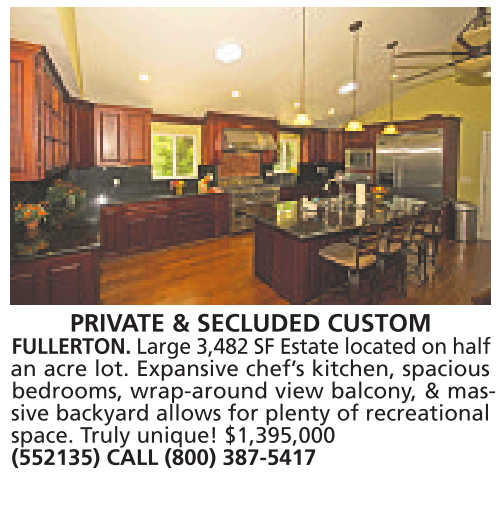 PRIVATE & SECLUDED CUSTOM FULLERTON. Large 3,482 SF Estate located on half an acre lot. Expansive chef’s kitchen, spacious bedrooms, wrap-around view balcony, & massive backyard allows for plenty of recreational space. Truly unique! $1,395,000 (552135) CALL (800) 387-5417
