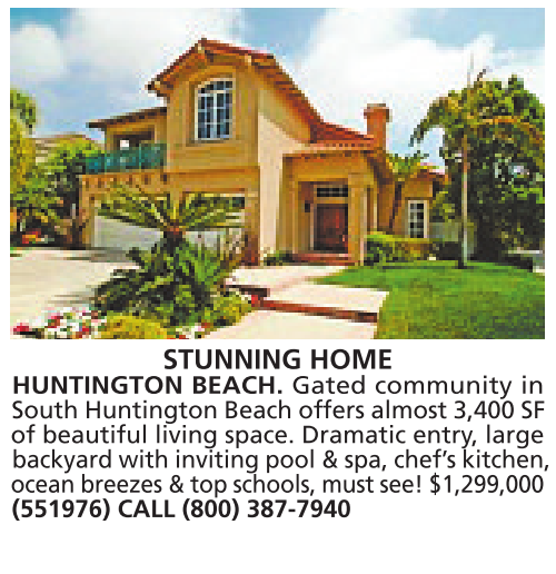 STUNNING HOME HUNTINGTON BEACH. Gated community in South Huntington Beach offers almost 3,400 SF of beautiful living space. Dramatic entry, large backyard with inviting pool &spa, chef’skitchen, ocean breezes &top schools, must see! $1,299,000 (551976) CALL (800) 387-7940