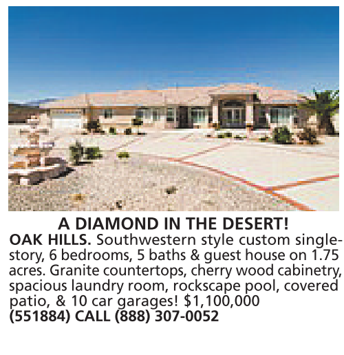 A DIAMOND IN THE DESERT! OAK HILLS. Southwestern style custom singlestory,6bedrooms, 5baths &guest house on 1.75 acres. Granite countertops, cherry wood cabinetry, spacious laundry room, rockscape pool, covered patio, & 10 car garages! $1,100,000 (551884) CALL (888) 307-0052
