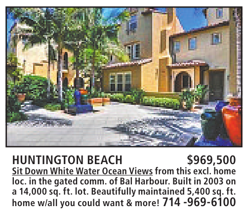 HUNTINGTON BEACH $969,500 SitDownWhiteWater OceanViewsfromthisexcl. home loc. in thegated comm.ofBal Harbour. Built in 2003 on a14,000 sq. ft.lot.Beautifully maintained 5,400 sq. ft. home w/all you could want &more! 714 -969-6100