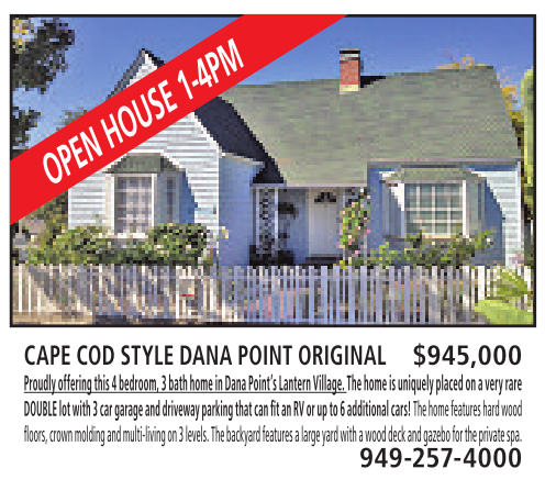 CAPE COD STYLE DANA POINT ORIGINAL $945,000 Proudlyoffering this 4bedroom,3bathhome in Dana Point’s LanternVillage.The home is uniquely placedonaveryrare DOUBLElot with 3car garage and driveway parking thatcan fit an RV or up to 6additionalcars! Thehome features hard wood floors,crown molding and multi-living on 3levels.The backyard featuresalarge yard with awood deck and gazebo for theprivate spa. 949-257-4000