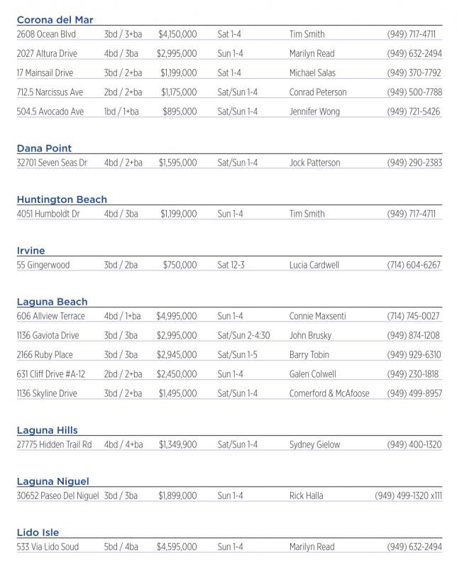 Corona del Mar 2608 Ocean Blvd 3bd /3+ba $4,150,000 Sat1-4 TimSmith (949) 717-4711 2027 AlturaDrive 4bd /3ba $2,995,000 Sun 1-4 Marilyn Read (949) 632-2494 17 Mainsail Drive 3bd /2+ba $1,199,000 Sat1-4 Michael Salas (949) 370-7792 712.5 Narcissus Ave 2bd /2+ba $1,175,000 Sat/Sun 1-4 Conrad Peterson (949) 500-7788 504.5 Avocado Ave 1bd /1+ba $895,000 Sat/Sun 1-4 Jennifer Wong (949) 721-5426