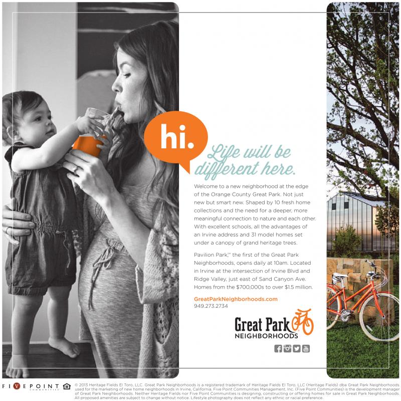 © 2013 Heritage Fields El Toro, LLC. Great Park Neighborhoods is a registered trademark of Heritage Fields El Toro, LLC (Heritage Fields) dba Great Park Neighborhoods used for the marketing ofnew home neighborhoods in Irvine, California. Five Point Communities Management, Inc. (Five Point Communities) is the development manager of Great Park Neighborhoods. Neither Heritage Fields nor Five Point Communities is designing, constructing or offering homes for sale in Great Park Neighborhoods. All proposed amenities are subject tochange without notice. Lifestyle photography does not reflect any ethnic orracial preference.