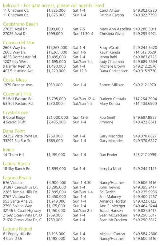 Belcourt - For gate access, please call agents listed 11 Chatham Ct. $1,825,000 Sat 1-4 Carol Allison 949.302.0220 11 Chatham Ct. $1,825,000 Sun 1-4 Patricia Carson 949.922.7399 Capistrano Beach 27025 Azul Dr. $999,000 Sat 2-5 Mary Ann Azzolina 949.280.3911 27025 Azul Dr. $999,000 Sun 11:30-4 Christina Givot 949.295.9974 Corona del Mar 2605 Way Ln. $11,265,000 Sat 1-4 Robyn/Scott 949.244.5420 2605 Way Ln. $11,265,000 Sun 1-5 Kevin Kanda 714.612.0529 4633 Dorchester Rd. $3,495,000 Sat 1-4 Jenna Bahl 949.887.8725 1207 Key West $2,695,000 Sat/Sun 1-4 Jody Chapman 949.689.8594 9 Barrier Reef Dr. $1,490,000 Sat 1-4 Michelle Brown 949.212.2576 407.5 Jasmine Ave. $1,220,000 Sat 12-3 Dana Christensen 949.315.9720 Costa Mesa 1979 Orange Ave. $939,000 Sun 1-4 Robert Milliken 949.212.1970 Covenant Hills 81 Bell Pasture Rd. $3,795,000 Sat/Sun 12-4 Darleen Centala 714.264.2994 63 Bell Pasture Rd. $530,000+ Sat/Sun 1-5 Mary Kontra 714.403.6500 Crystal Cove 8 Coral Ridge $21,000,000 Sun 12-5 Rob Smith 949.697.8855 4 Scenic Bluff $7,495,000 Sun 1-4 Jim/Jane 949.422.8611 Dana Point 24352 Vista Point Ln. $759,000 Sat 1-4 Gary Macrides 949.370.6827 33292 Big Sur St. $689,000 Sun 1-4 Gary Macrides 949.370.6827 Irvine 14 Thorn Hill $1,199,000 Sun 1-4 Dan Finder 323.217.9999 Ladera Ranch 18 Sky Ranch Rd. $2,899,000 Sat 1-4 Jerry La Mott 949.244.7145 Laguna Beach 676 Vista Ln. $4,900,000 Sun 1-4:30 Nancy/Heather 949.606.6116 31387 Ceanothus Dr. $3,295,000 Sat 1-4 John Treviño 949.395.2417 2285 Temple Hills Dr. $2,895,000 Sat/Sun 1-4 Ed Gazich 949.235.9936 2767 Victoria Dr. $2,450,000 Sun 1-4 Erin Maloney 949.400.7257 953 Santa Ana St. $1,249,000 Sun 1-4 Amanda Horton 949.422.6122 2790 Solana Way $1,175,000 Sun 1-4 Ann E. Metzger 949.464.3244 32146S.Coast Highway $1,150,000 Sat/Sun 2-5 Traudi Hansen 949.887.3417 21692Ocean Vista Dr., D $759,000 Sat 1-4 Sean McCracken 949.290.5317 21692Ocean Vista Dr., C $759,000 Sat 1-4 Sean McCracken 949.290.5317 Laguna Niguel 61 Poppy Hills Rd. $3,195,000 Sat 1-4 Michael Caruso 949.584.2300 4 Cala D Or $1,198,000 Sat 1-5 Nancy/Heather 949.606.6116