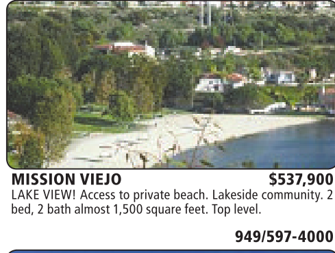 MISSION VIEJO $537,900 LAKE VIEW! Access to private beach. Lakeside community. 2 bed,2bathalmost 1,500squarefeet. Toplevel.