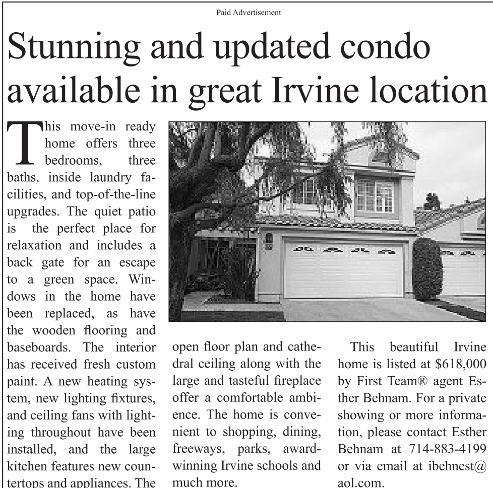 This beautiful Irvine home is listed at $618,000 by First Team® agent Esther Behnam. For a private showing or more information, please contact Esther Behnam at 714-883-4199 or via email at ibehnest@ aol.com.