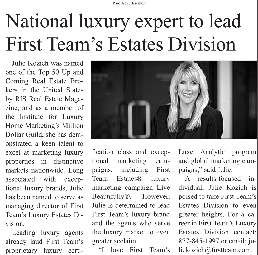 A results-focused individual, Julie Kozich is poised to take First Team’s Estates Division to even greater heights. For a career in First Team’s Luxury Estates Division contact: 877-845-1997 or email: juliekozich@firstteam.com.