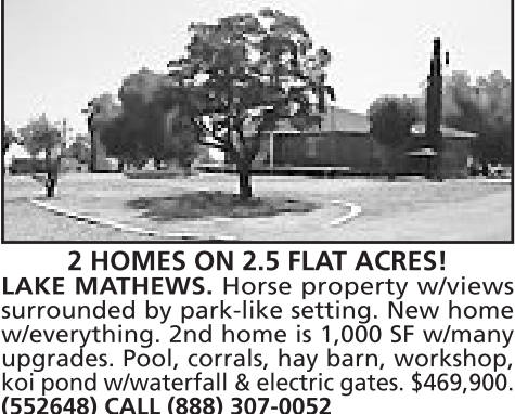 upgrades. Pool, corrals, hay barn, workshop, koi pond w/waterfall &electric gates. $469,900. (552648) CALL (888) 307-0052