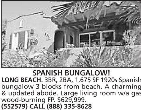 LONG BEACH. 3BR, 2BA, 1,675 SF 1920s Spanish bungalow 3 blocks from beach. A charming & updated abode. Large living room w/a gas wood-burning FP. $629,999. (552579) CALL (888) 335-8628