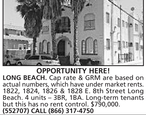 LONG BEACH. Cap rate & GRM are based on actual numbers, which have under market rents. 1822, 1824, 1826 & 1828 E. 8th Street Long Beach. 4 units – 3BR, 1BA. Long-term tenants but this has no rent control. $790,000. (552707) CALL (866) 317-4750