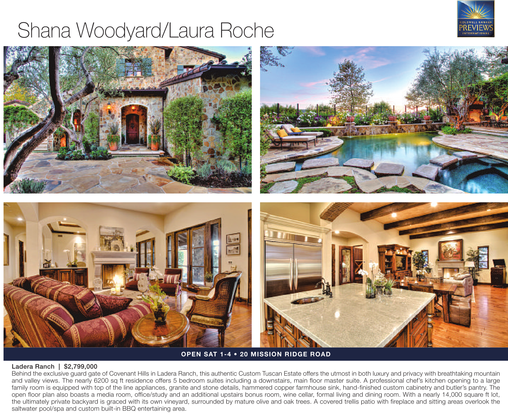 family room is equipped with top of the line appliances, granite and stone details, hammered copper farmhouse sink, hand-finished custom cabinetry and butler’s pantry. The open floor plan also boasts a media room, office/study and an additional upstairs bonus room, wine cellar, formal living and dining room. With a nearly 14,000 square ft lot, the ultimately private backyard is graced with its own vineyard, surrounded by mature olive and oak trees. A covered trellis patio with fireplace and sitting areas overlook the saltwater pool/spa and custom built-in BBQ entertaining area.