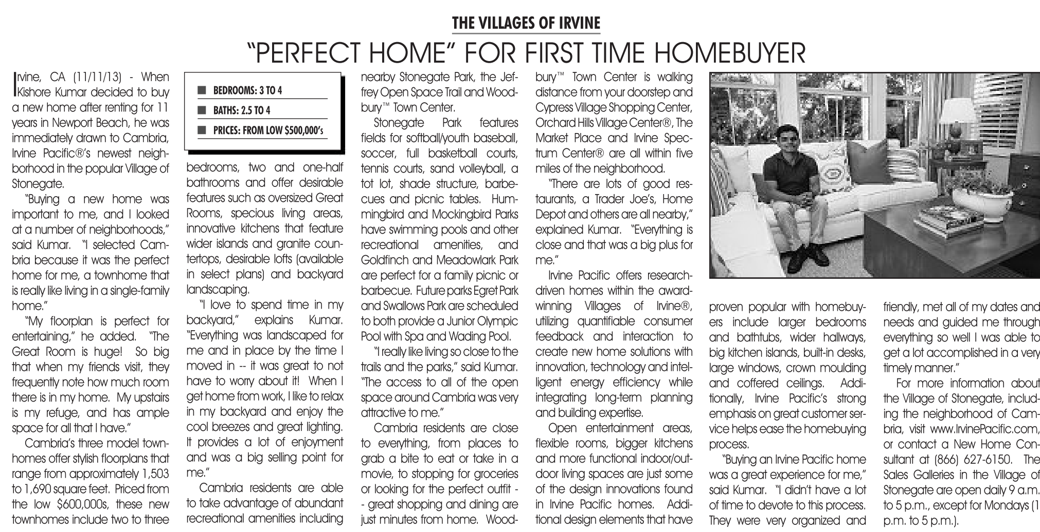 “Buying an Irvine Pacific home was a great experience for me,” said Kumar. “I didn’t have a lot of time to devote to this process. They were very organized and