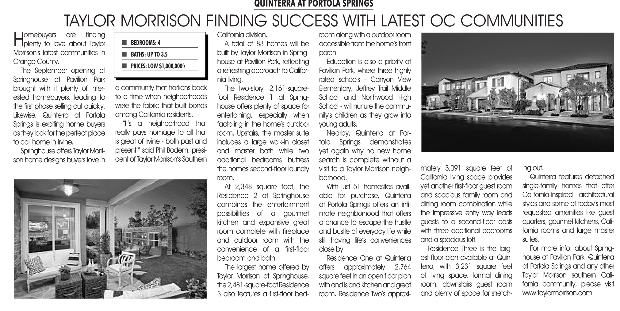 For more info. about Springhouse at Pavilion Park, Quinterra at Portola Springs and any other Taylor Morrison southern California community, please visit www.taylormorrison.com.
