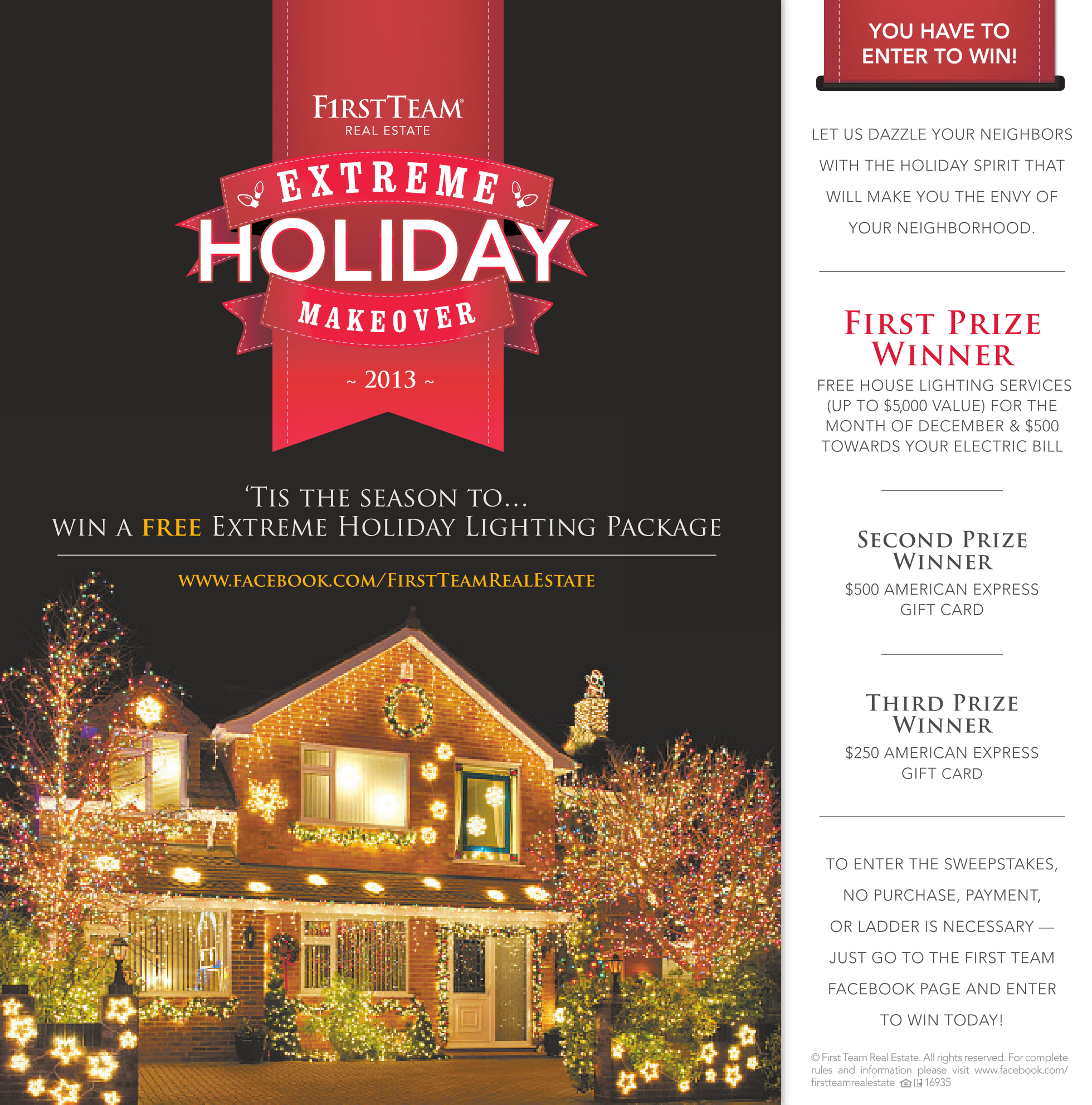 ~ 2013 ~ ‘Tis the season to… win a free Extreme Holiday Lighting Package www.facebook.com/FirstTeamRealEstate YOU HAVE TO ENTER TO WIN! LET US DAZZLE YOUR NEIGHBORS WITH THE HOLIDAY SPIRIT THAT WILL MAKE YOU THE ENVY OF YOUR NEIGHBORHOOD. First Prize Winner FREE HOUSE LIGHTING SERVICES (UP TO $5,000 VALUE) FOR THE MONTH OF DECEMBER & $500 TOWARDS YOUR ELECTRIC BILL Second Prize Winner $500 AMERICAN EXPRESS GIFT CARD Third Prize Winner $250 AMERICAN EXPRESS GIFT CARD TO ENTER THE SWEEPSTAKES, NO PURCHASE, PAYMENT, OR LADDER IS NECESSARY — JUST GO TO THE FIRST TEAM FACEBOOK PAGE AND ENTER TO WIN TODAY! ©First Team Real Estate.All rights reserved.For complete rules and information please visit www.facebook.com/ firstteamrealestate 16935