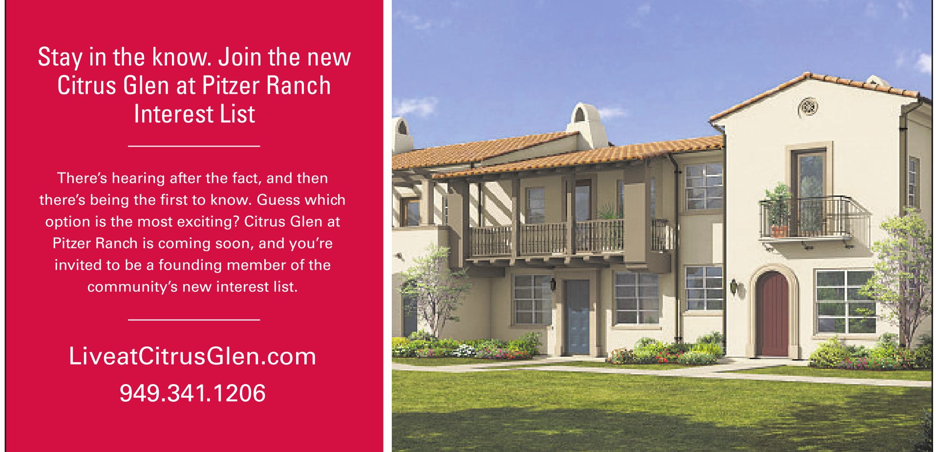 Stay in the know. Join the new Citrus Glen at Pitzer Ranch Interest List There’s hearing after the fact, and then there’s being the first to know. Guess which option is the most exciting? Citrus Glen at Pitzer Ranch is coming soon, and you’re invited to be a founding member of the community’s new interest list. LiveatCitrusGlen.com 949.341.1206