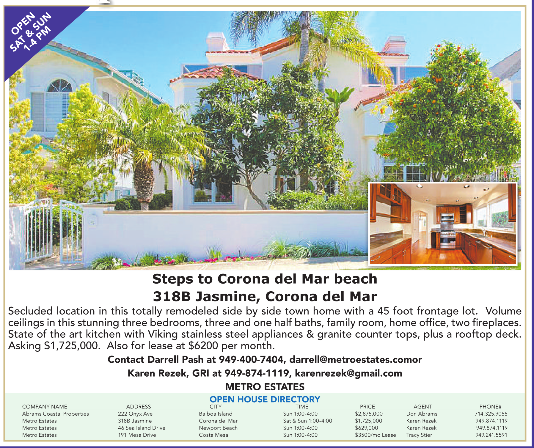Abrams Coastal Properties 222 Onyx Ave Balboa Island Sun 1:00-4:00 $2,875,000 Don Abrams 714.325.9055 Metro Estates 318B Jasmine Corona del Mar Sat &Sun 1:00-4:00 $1,725,000 Karen Rezek 949.874.1119 Metro Estates 46Sea Island Drive Newport Beach Sun 1:00-4:00 $629,000 Karen Rezek 949.874.1119 Metro Estates 191 Mesa Drive Costa Mesa Sun 1:00-4:00 $3500/mo Lease Tracy Stier 949.241.5591