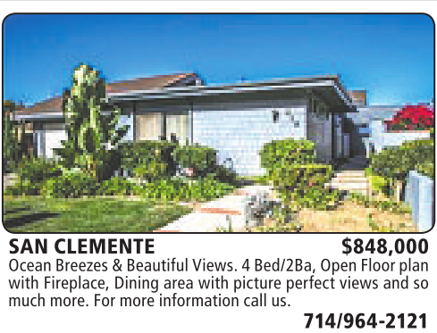 SAN CLEMENTE $848,000 Ocean Breezes&BeautifulViews. 4Bed/2Ba,OpenFloor plan with Fireplace, Dining area with picture perfect views and so muchmore.For more informationcallus.