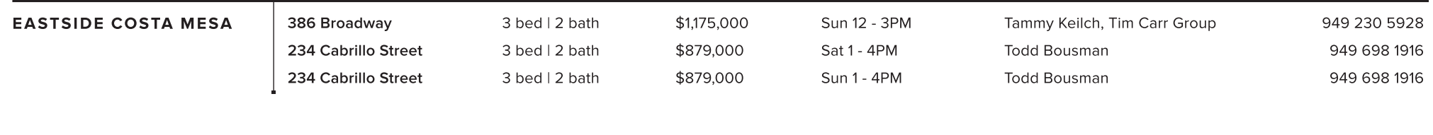 EASTSIDE COSTA MESA 386 Broadway 3 bed | 2 bath $1,175,000 Sun 12 - 3PM Tammy Keilch, Tim Carr Group 949 230 5928 234 Cabrillo Street 3 bed | 2 bath $879,000 Sat 1 - 4PM Todd Bousman 949 698 1916 234 Cabrillo Street 3 bed | 2 bath $879,000 Sun 1 - 4PM Todd Bousman 949 698 1916