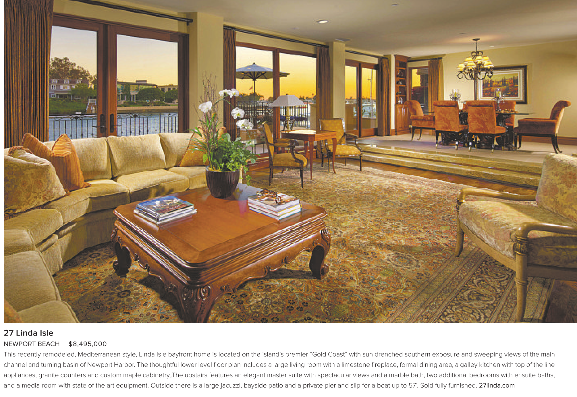 NEWPORT BEACH | $8,495,000 This recently remodeled, Mediterranean style, Linda Isle bayfront home is located on the island’s premier “Gold Coast” with sun drenched southern exposure and sweeping views of the main channel and turning basin of Newport Harbor.The thoughtful lower level floor plan includes alarge living room with alimestone fireplace,formal dining area, agalley kitchen with top of the line appliances, granite counters and custom maple cabinetry,.The upstairs features an elegant master suite with spectacular views and a marble bath, two additional bedrooms with ensuite baths, and a media room with state of the art equipment. Outside there is a large jacuzzi, bayside patio and a private pier and slip for a boat up to 57’. Sold fully furnished. 27linda.com