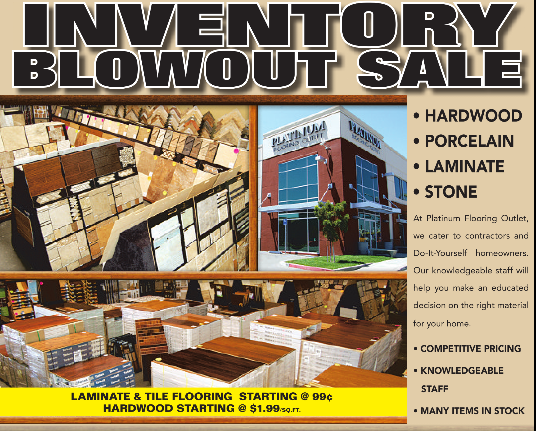 INVENTORY BLOWOUT SALE LAMINATE & TILE FLOORING STARTING @ 99¢ HARDWOOD STARTING @ $1.99/SQ.FT. • HARDWOOD • PORCELAIN • LAMINATE • STONE At Platinum Flooring Outlet, we cater to contractors and Do-It-Yourself homeowners. Our knowledgeable staff will help you make an educated decision on the right material for your home. • COMPETITIVE PRICING • KNOWLEDGEABLE STAFF • MANY ITEMS IN STOCK