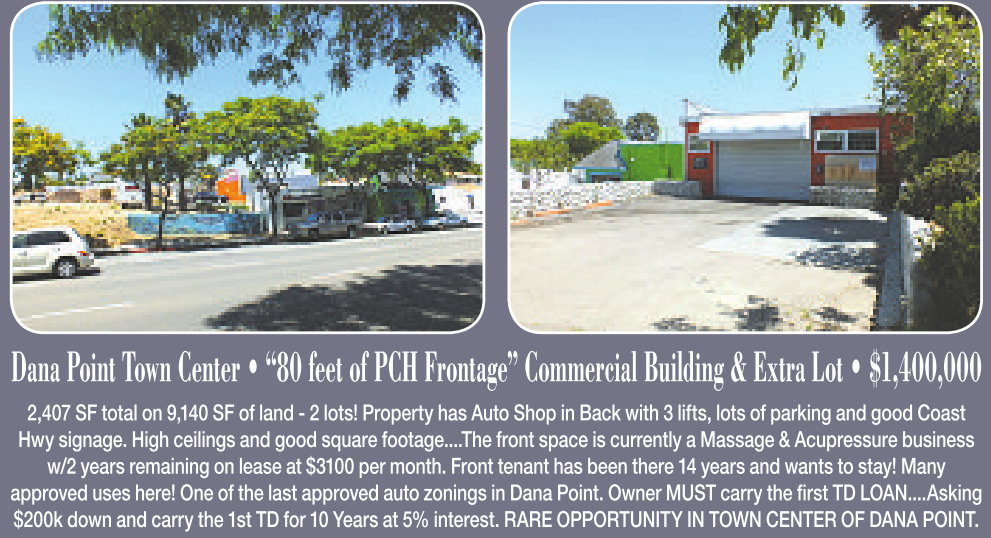 Dana Point Town Center • “80 feet of PCH Frontage” Commercial Building & Extra Lot • $1,400,000 2,407SFtotal on 9,140SFofland-2lots! Property hasAutoShop in Back with 3lifts, lots of parking andgood Coast Hwysignage.Highceilings andgood square footage....Thefront space is currentlyaMassage&Acupressurebusiness w/2years remainingonlease at $3100per month.Front tenant hasbeenthere 14 yearsand wantstostay! Many approveduses here!One of the last approvedautozoningsinDanaPoint.Owner MUST carrythe first TD LOAN....Asking $200kdownand carrythe 1stTDfor 10 Yearsat5%interest. RARE OPPORTUNITYINTOWNCENTEROFDANA POINT.