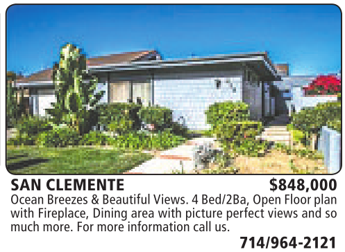 SAN CLEMENTE $848,000 Ocean Breezes&BeautifulViews. 4Bed/2Ba,OpenFloor plan with Fireplace, Dining area with picture perfect views and so muchmore.For more informationcallus.