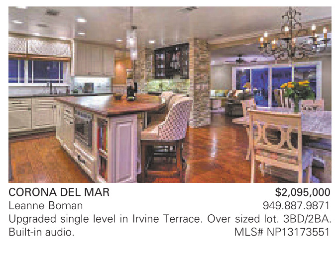 CORONA DEL MAR $2,095,000 Leanne Boman 949.887.9871 Upgraded single level in Irvine Terrace. Over sized lot. 3BD/2BA. Built-in audio. MLS# NP13173551