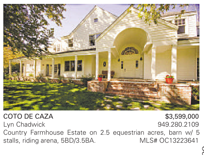 COTO DE CAZA $3,599,000 Lyn Chadwick 949.280.2109 Country Farmhouse Estate on 2.5 equestrian acres, barn w/ 5 stalls, riding arena, 5BD/3.5BA. MLS# OC13223641