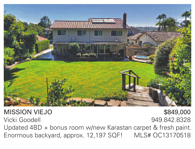 MISSION VIEJO $849,000 Vicki Goodell 949.842.8328 Updated 4BD + bonus room w/new Karastan carpet & fresh paint. Enormous backyard, approx. 12,197 SQF! MLS# OC13170518